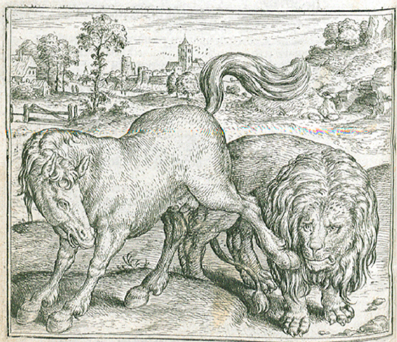 [De leeuw en het paard] Zeer wij wijs doordacht Tegen die zijn geveinsd. Mattheus 7. Van de valse profeten wacht wel uw zinnen In al uw beginnen, Die in schapen kleren geveinsd bij u komen En nochtans grijpende wolven zijn van binnen Zichzelf gewinnen, Tot de anders schade en schande zoeken zij Maar sommigen zijn van de plagen niet vrij Want die ze menen te hinderen in alle manieren Daarvan worden ze allereerst geslagen. [7] De leeuw en het paard. De leeuw vond een paard in het groene gras Wat hij om te verslinden vals kwam omringen Hij zei dat hij een medicijn meester was Die alle kwetsingen en ziekten genas: Dus kwellen u (zei hij tot het paard) enige dingen Ik zal u wel helpen en te been brengen Want het lijkt me dat u iets let of deert, Ondertussen dacht hij. Mag ik u aldus bespringen Ik zal u bijten of de hals af wringen: Pluimstrijkers die zijn niet te horen waard. Ik verblijd mij (sprak het paard) medicijn meester goed Dat ge recht te pas komt ter oorzaak van deze Want ik heb daar een doorn in mijn achter voet Ik bid u, wilt ge me daarvan terstond genezen De leeuw loopt er naar. Het paard heeft het been opgeheven En gaf hem voor het hoofd een klap zo hard, Dat het de leeuw duizelde en verloor schier zijn wezen: Met schade en schande men vaak meester wordt. Insgelijks sommige mensen zich van buiten gelaten Dat ze vrienden zijn onder een statig kleed En het zijn doodsvijanden die tot hun baten Heimelijk zoeken te doen groot leed. Diegene die zijn openbare vijand weet, Mag zich er voor hoeden en wachten: Wetenschap gaat voor natuurlijke krachten. [8] |