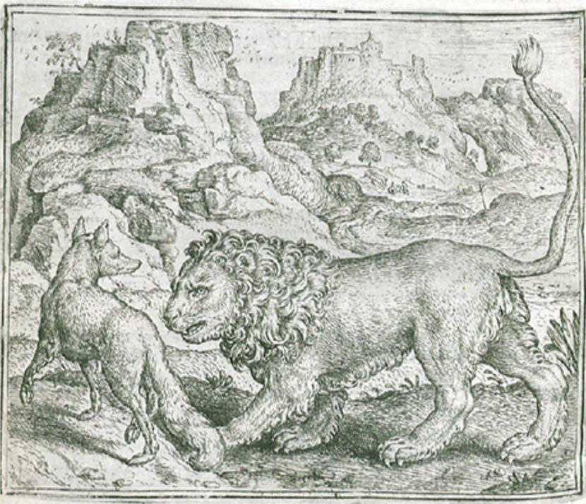 [De leeuw en vos] Wandelt wijs omtrent, Die gij niet kent. Deuteronomium 5. Psalm 24. Zal ter rechter noch linker hand niet gaan, maar Wandelen openbaar door de weg Die de heer heeft geboden opdat ge mocht leven En op dat u goeds geschiede voorwaar En de dagen van uw leven mogen daarna Verlengd worden eenparig. In het land van uw bezittingen verheven: Want de Heer zijn wegen zijn van rust en vrede, Barmhartigheid en waarachtigheid. [21] De leeuw en vos. De vos ging uit om een prooi naar zijn aard Zag van verre de leeuw, dus nam hij de vlucht Als van een lelijk dier, want hij was bang, Maar toen hij de leeuw andermaal in het gemoed kwam Vond hij hem niet zo kwaad noch gram: Nochtans heeft hij hem van verre maar gegroet Want zulke (dacht hij) gaat vaak stil als een lam, Die men wel tijdelijk en schadelijk ontmoet. De leeuw kwam de vos noch eens of tweemaal omtrent Toen werd hij hoe langer hoe minder bevreesd naar het betamen Mits dat hij hem geleidelijk aan beter heeft gekend En toen elk de andere noch nader kwamen, Zo verstoutte zich de vos zonder vrees of schaamte Hem aan te spreken als van gelijke zin: En ze kwamen daarna vaak tezamen Men zegt wel dat onbekend is maakt onmin. Insgelijks die bij gewoonte met grote lieden verkeren Met de tijd zij daaraan vriendschap houden Die ze eerst vreesden, daarna minnen en eren: Want de gewoonte leert alle dingen zo wij aanschouwen Men zal niet schuwen die men mag vertrouwen. [22] |