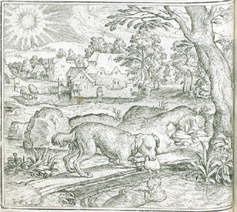 [De hond die een stuk vlees draagt] Niemand zal in zijn generen, Onzekere zaken begeren. Ecclesiasticus 14. Job 20. Het oog dier gierige is onverzadigbaar Ofschoon hij heeft dat men mag begeren Zo zal hij dat (als geheel ongestadig) Zelf bezitten, maar geheel ontberen. Spreuken 23. Ecclesiasticus, Apostels 3. Om rijk te zijn werk niet Maat stel uw verstand dermate naar de deugd En zie toch niet naar rijkdom: Datgene dat gij niet hebben mocht In onrechte bezittingen niet verheugen. [23] De hond die een stuk vlees draagt. Een hond met een stuk vlees, wat hem stond duur Waande te maken sier En droeg het in zijn muil, al was het wat zwaar, Passeerde een plank over de rivier Daar de zon in het water scheen mooi en helder Het stuk vlees gaf een schaduw aldaar; De hond zag dit en meende er naar te slokken En twee stukken voor een te hebben, maar Het vlees ontviel hem en hij keek ernaar, Sommigen verwachten twee voor een en verliezen beide brokken. Hij had het anders hoe hij wilde schransen Bassen, huilen, kwispelstaarten, hij moest door draven Hoe gapende dat ook de honger hem joeg Was hij dorstig verhit, hij mocht zich laven Want daar zijn vlees bleef was drinken genoeg Hij zag van verre de brok die hij eerst droeg Maar hij kon zich daarmee niet spijzigen Om lopen hem niet zeer de pens-zak woog Dus mocht hij ongeladen ras huiswaarts bijten. Alzo varen meest de gulzige mensen Die genoeg hebben voor hun onderhoud: Want terwijl zij veel zaken willen en wensen, Verliezen zij dat zij hadden en worden benauwd Dus elk behoudt dat hij heeft opdat het hem niet berouwd. [24] |