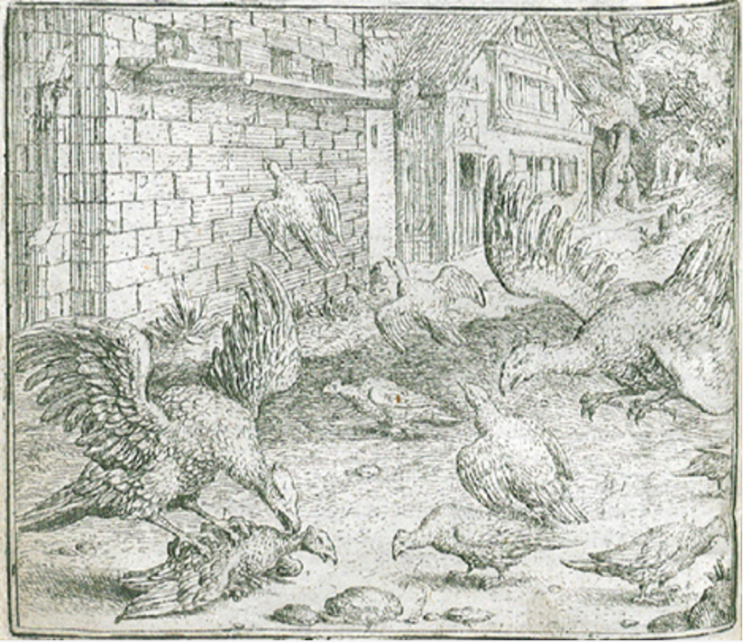 [De hen en haar kuikens] Wil voor de grijpende zwermen. De onschuldige beschermen. Esai. 9. Geweldige beroving is misprezen En het kleed van al zulke gieren Met bloed gemengd zal verbrand wezen: En worden de spijs van het vuur. Houdt op van te doen enig kwaad En doe goed, Met uw oordelen ga recht door Sta de droevige bij: Dot de wezen recht, dan ben je verstandig. [19] De hen en haar kuikens. De havik gier en wouw hadden vermeten Jong kuikenvlees te eten Dus ze beiden uitvlogen als wild van aard Ze zagen een kuikenkooi waaronder was gezeten, De hen die haar kuikens zeer goed bewaarde En van deze vijanden niet bang werd: Want ze konden daaromtrent niet komen Ze zagen haar leed wat hen bezwaarde Maar niemand noch bij te komen hen aanviel: Maar elk zich spaarde, Aan voorzienig waken men de zorg herkent. De hen werd gewaar deze partijen Bereide zich tot strijden Haar kooi omringde ze zonder er af te gaan Haar kuikens hield ze bijeen, wist ze te mijden En toen het nood was heeft ze die onder haar vlerken ontvangen De vijanden hield ze in het oog zonder verflauwen, Ze bood ze de bek met een zeer kloeke moed Wat bespieders mochten tegen haar opstaan Daar werd niets misdaan: En waren zo beschermd van tegenspoed Een oogje in het zeil te hebben is meer dan de schippers goed. Zo zal men ook met voorzienige vlijt De onschuldige weesjes alle bijstand doen Hen beschermen voor die hen graag onrecht deden: En bewaren in vrede, Tegen de loosgierige grijpende hand.[20] |