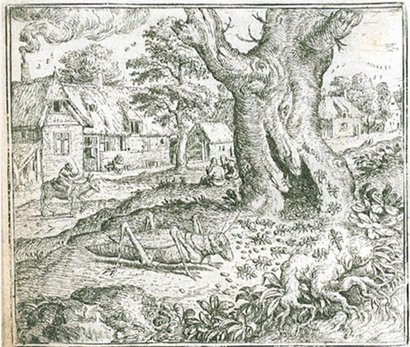 [Mieren en krekel] Tegen de nood van de tijd, Wel zorgvuldig zijt. Ecclesiasticus 9. Vlijtig wil ge wezen te alle seizoenen Alles wat u voor handen komt te doen Doe dat vrolijk tot uw nood: Ga dan met blijdschap eten uw brood, En drink uw wijn met goed gemoed Zo zal je bewaard zijn van tegenspoed. Spreuken 28. Die zijn akker bewerkt als tot arbeid wakker Zal hebben brood genoeg: Maar wie ledig gaat zal met ellende kwaad Vervuld wezen vroeg, [27] Mieren en krekel. Een groot gekrioel van mieren aan de water stroom Hadden vlijtig hun oogst ingehaald Logeerden eenparig in een holle boom Daar waren ze goed voorzien van goed tarwe graan: Eer dat ze de zomer voorbij lieten gaan, Opdat ze in de winter daarvan mochten leven De krekel kwam derwaarts al springend gelijk, Die (door de nood) graag had wat ingewreven: Die niet helpt bezuren zal men het zoete niet geven. De krekel eiste van het proviand een deel Want van honger voelde hij zeer groot lijden: Maar de mieren ontzeiden hem dat geheel En kreeg niets anders dan een troostend verblijden En vroegen hem was hij te zomerse tijden Meest had gedaan of te doen plag? Hij zei; in het koren hield ik mijn bevrijden Daar ik zorgeloos mijn tijd doorbracht Om de winter dacht ik niet, hoe het varen mocht. Wij zullen als de mieren zorg dragen En terwijl we hebben het zomerse behagen Dat is in de jonkheid als we noch sterk zijn en koen, Zullen tegen de winter, dat zijn de oude dagen: Eer we bij andere klagen en hebben van doen, Vlijtig zijn om ons en andere te voeden. [28] |