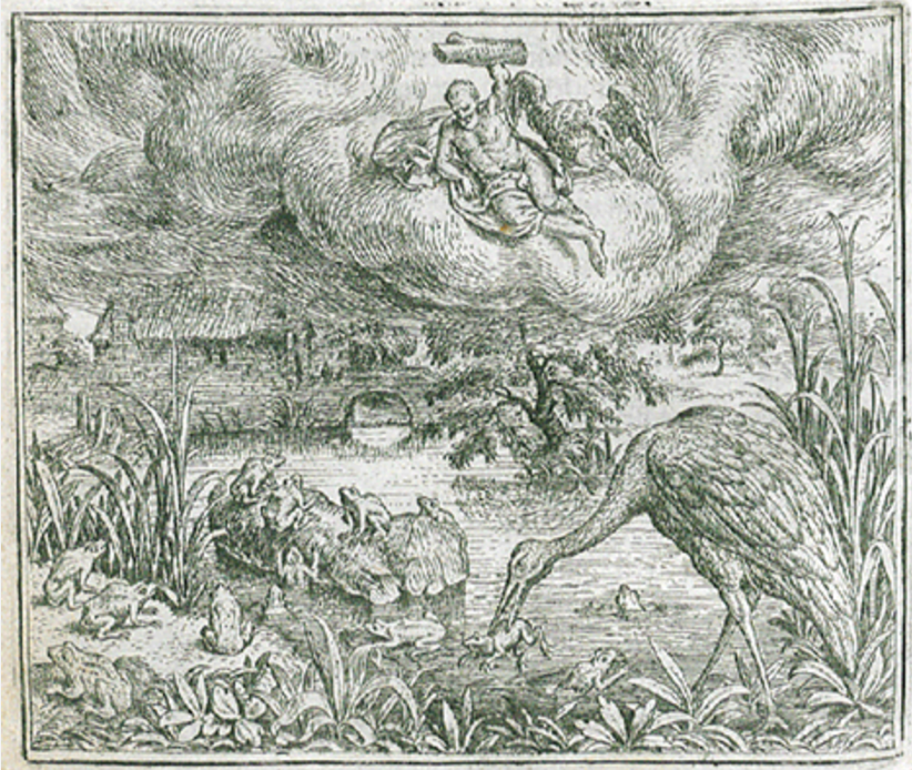 [Jupiter en kikkers] Altijd zal men leren, De goede prinsen te eren. 1. Petrus, 2. Titus, 2. In alle vrees tot uw heren Gij dienaars toont onderdanigheid, Niet alleen diegene die deugdzaam verkeren En goedheid vermeerderen, Maar ook diegenen die straf en hard zijn mede Daar niets tegen zeggen, te geen plaats Voldoen met een bedriegend gemoed: Maar toon alle trouwheid goed Ee wat ge doet, vreest God uit liefde zeer, Zo insgelijks biedt de koning eer. [37] Jupiter en kikkers. De kikkers waren vrij in hun watersteden Hebben Jupiter menigmaal gebeden Dat hij hen een koning wilde geven Blijven begeren en geenszins tevreden, Wierp hij een groot blok beneden Door het grote geruis in het water begonnen ze te beven: Ze zwegen, ze zagen daar omtrent gedreven, Waren verblijd en hebben hem gegroet Wat eerbetoon ze hem deden, vonden daarin geen leven Van kloekheid beseft Maar is stil gebleven Dus waren ze alle tezamen niet gerust in het gemoed Soms is de overheid te streng en soms te goed. Daardoor was hen die koning niet aangenaam Opnieuw baden ze eerzaam Om een ander, krachtiger en het is geschied: Hij zond de ooievaar die ze betamelijk ontvingen Die terstond hen bestormde zonder iets te wachten Hij verzwolg er diversen, spaarde er niet een Bezocht ze in het lis en riet De kikkers verbaasd van dit magere avontuur Baden om geholpen te worden uit het zware verdriet Zongen op hun lied: Dat ze een andere koning mochten hebben tot hun eer, Zulke die waant te zijn verhoord zingt voor een dovemans deur. Zo varen zij die vredig zijn geregeerd Van een goedaardige prins aan allen zijden En niet kunnen houden als ondankbaar gemanierd: De Heer God zendt een die ze ruw hanteert, Om die weeldig zaten met oorlog te kastijden. [38] |