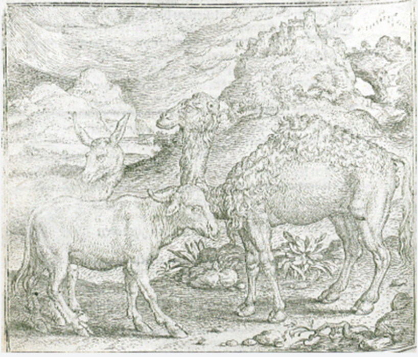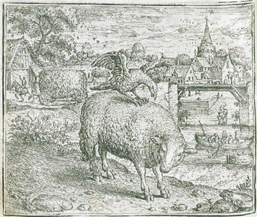 Eduard de Dene, de ware fabels der dieren waarvan de eigenschappen vergeleken worden met Bijbelse teksten en zo kan men leren hoe men leven moet. Uit: https://www.dbnl.org/tekst/dene001wara01_01/dene001wara01_01_0007.php