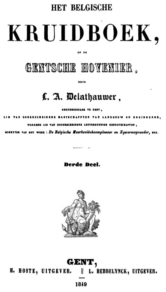 Belgisch kruidboek of de Gentsche hovenier. L. A. Delathauwer, Gent. Geeft details over het gebruik, kweken, verzorgen en oogsten van diverse kruiden. Uit; https://books.google.nl/books/about/Het_Belgische_kruidboek_of_de_Gentsche_h.html?id=V_xBAAAAcAAJ&redir_esc=y